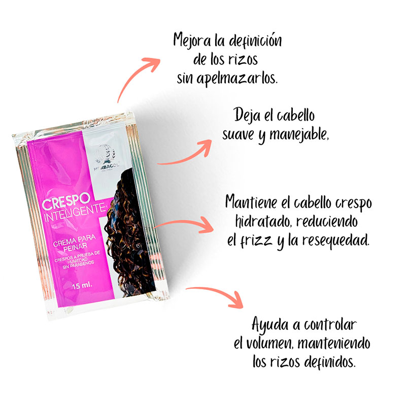 - Tratamiento Rizos con nutrición intensiva: El Tratamiento Rizos Definidos Crespo Inteligente sachet 15 ml proporciona una hidratación profunda para rizos vibrantes.