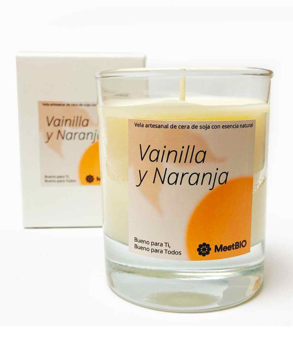 Vela de cera de soja artesanal con esencia natural de vainilla y naranja.