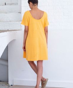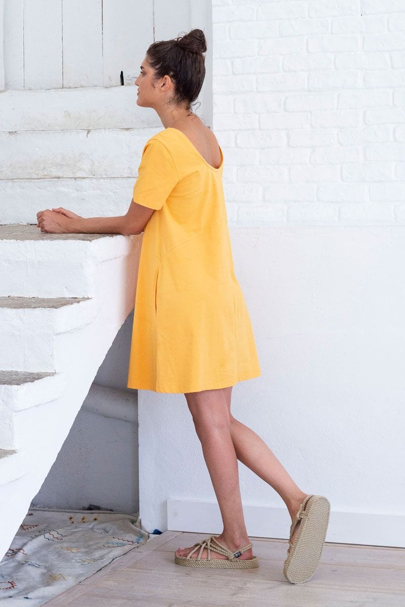 El vestido corto amarillo está diseñado en España y hecho en India de forma ética.