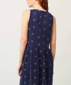 Vestido escote V azul marino con estampado de origami.