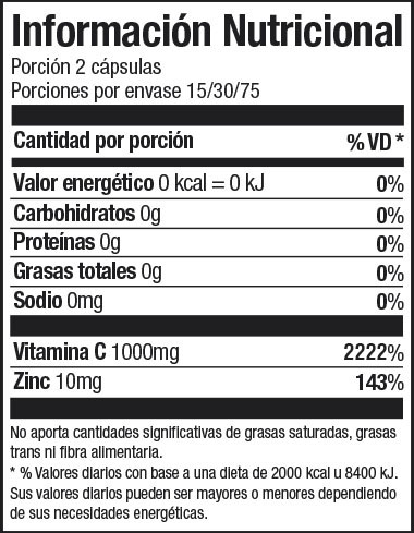 - 2 cápsulas diarias aportan: 1000mg Vitamina C (2222% IDR) 10mg Zinc (143% IDR), IDR=Ingesta Diaria Recomendada