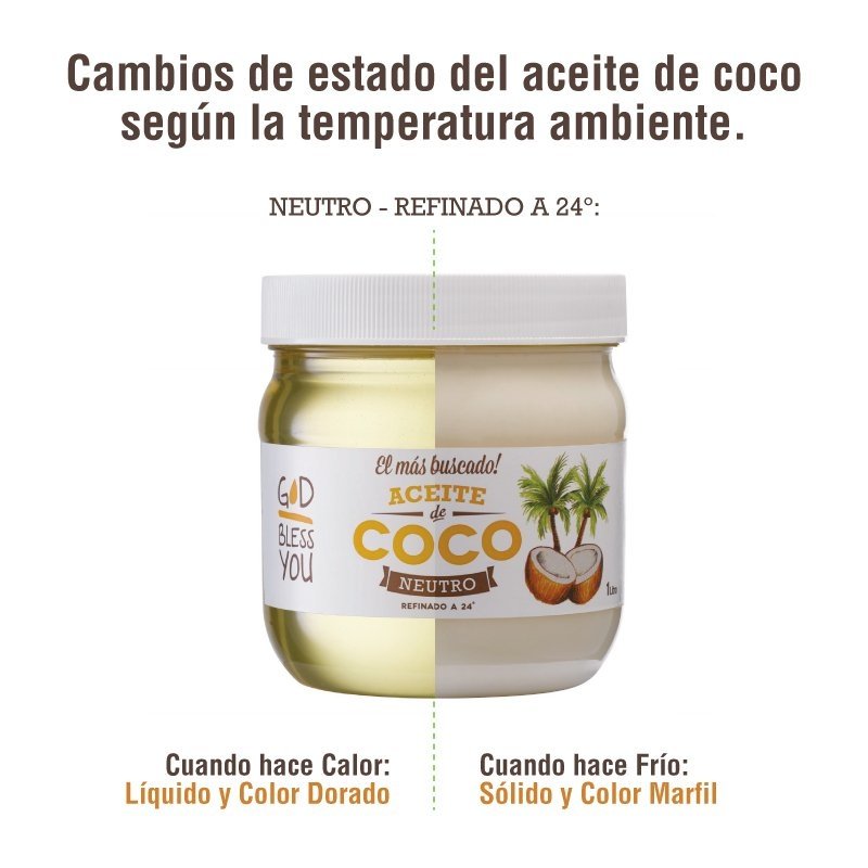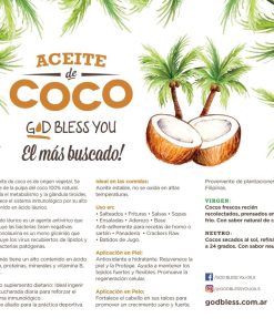 Aceite de coco God Bless You calidad premium. Proveniente de plantaciones Filipinas de cocos secados al sol llamado Copra. Se exprime la pulpa de este fruto, y se refina (proceso rbd). Durante el proceso de refinamiento todo color, sabor y olor se eliminan a través de medios naturales, lográndose uno de los mejores aceites de coco y el más buscado en el mercado.