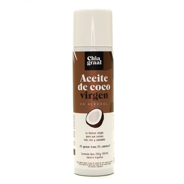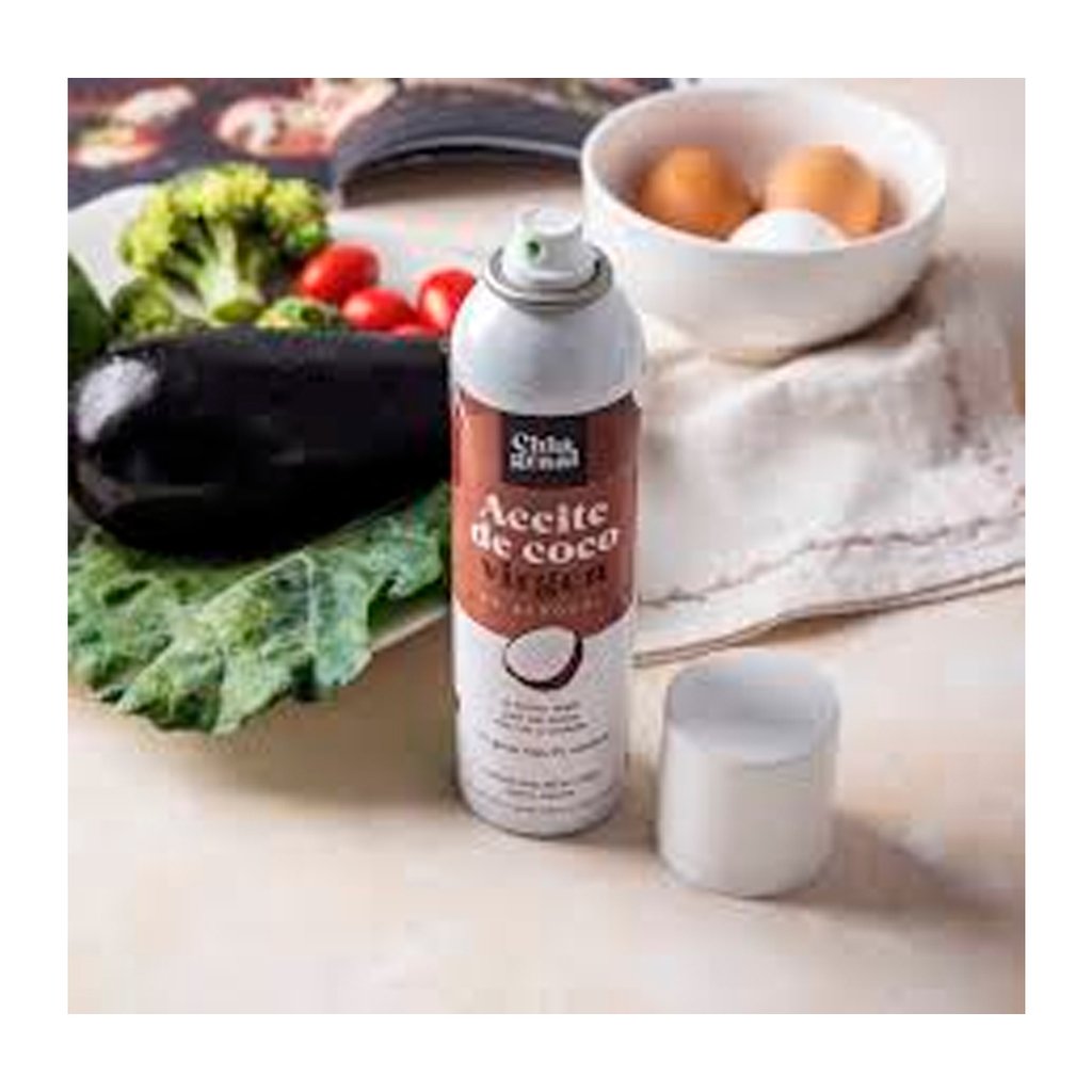 Aceite de coco virgen en aerosol. Prensado en frio, con sabor y aroma natural a coco.