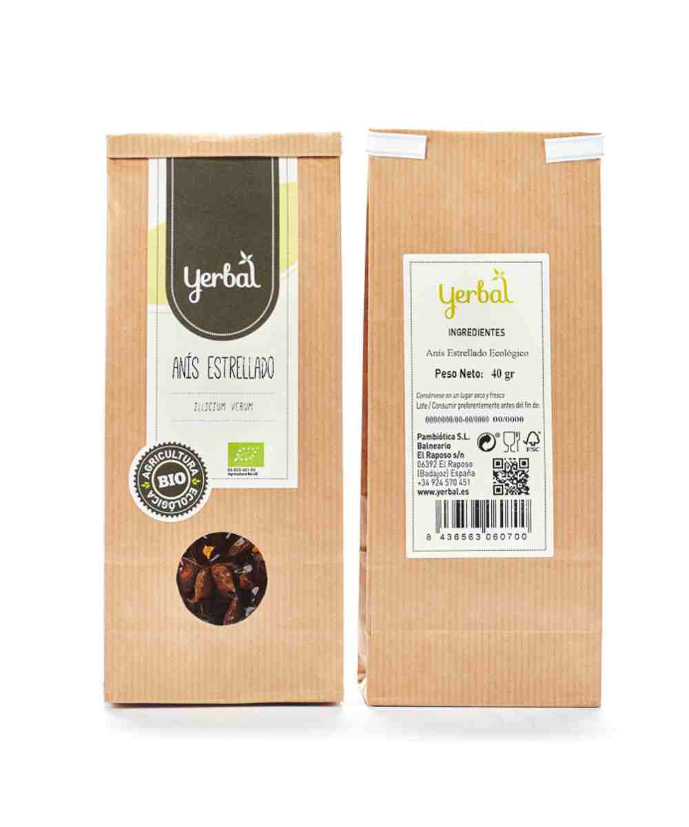 Anís Estrellado entero BIO de Yerbal con certificación ecológica, envasados a granel en bolsa kraft con práctico cierre.