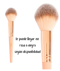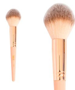 Brocha de doble fibra con cerdas suaves, largas, semidensa y forma redondeada, ideal para aplicar rubor en crema y polvo.