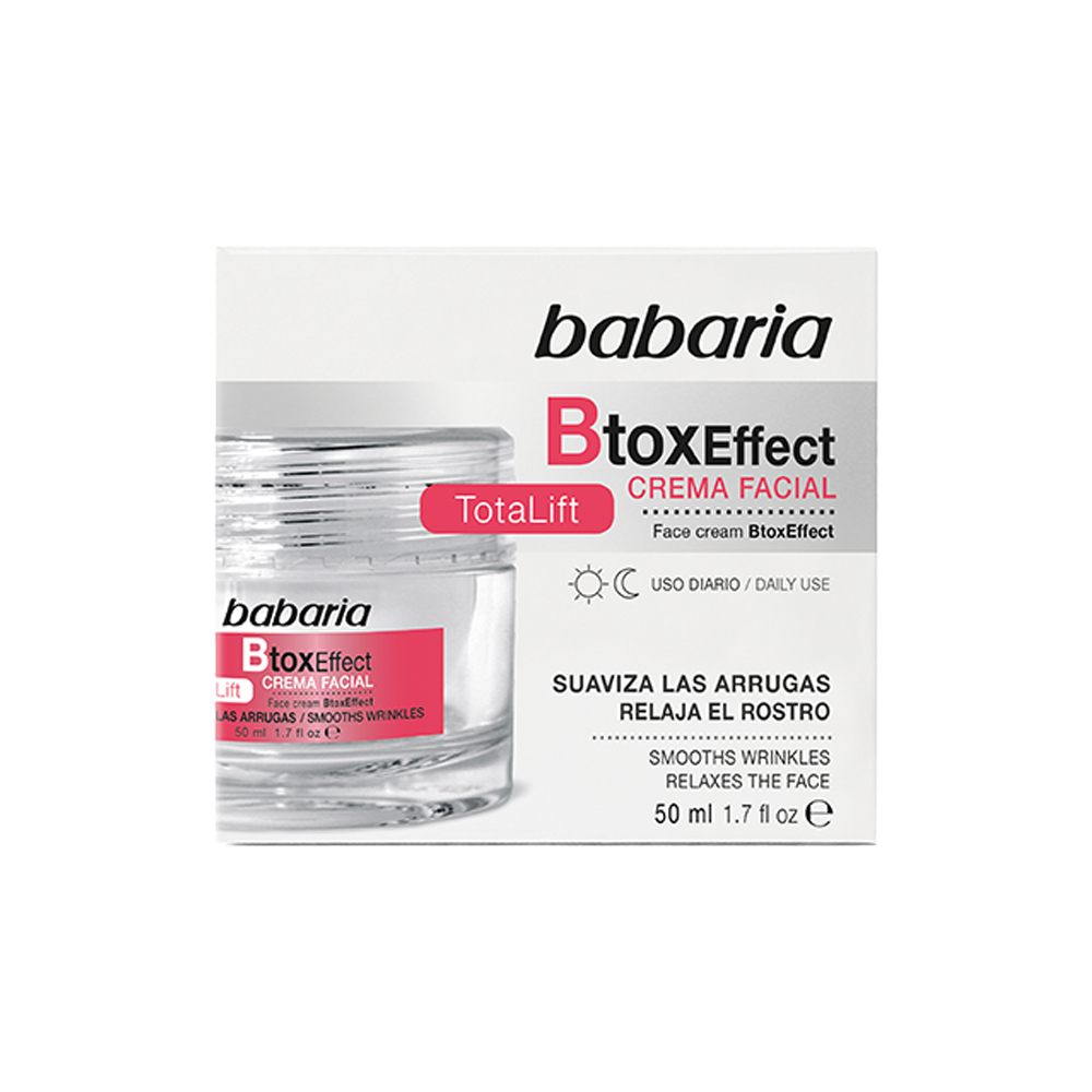 La crema facial Botox Effect de Babaria proporciona un efecto antiedad global. Formulada con un Tripéptido Botox-like, difumina las arrugas y aporta acción antioxidante.