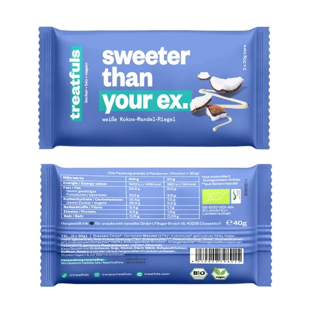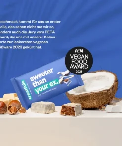 ¡Chocolate blanco vegano, sin azúcar refinado, sin aditivos y lleno de placer! ¡Eso es exactamente lo que es posible ahora, gracias a nuestros Creamy Coco Kisses! El cremoso sabor a coco dulce se combina con trozos de almendras con mantequilla de anacardo y se mezcla con un chocolate blanco vegano que se derrite en la boca. ¿Qué se siente? Casi tan dulces como unas vacaciones en el Caribe después de dejar a tu ex. Solo para las papilas gustativas. Y con la conciencia tranquila: chocolate orgánico certificado, de comercio justo y sin contenido animal. Ah, sí, tampoco contienen gluten, soja ni cacahuetes, ¡definitivamente una mejora con respecto a los de antes! Contenido por paquete: 2 barritas de 20 g