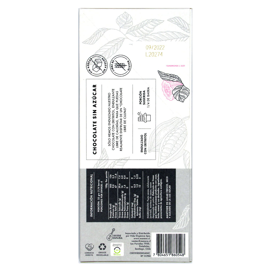 Ingredientes: pasta de cacao, eritritol, manteca de cacao, inulina, lecitina de girasol. Ingredientes provenientes de agricultura orgánica.