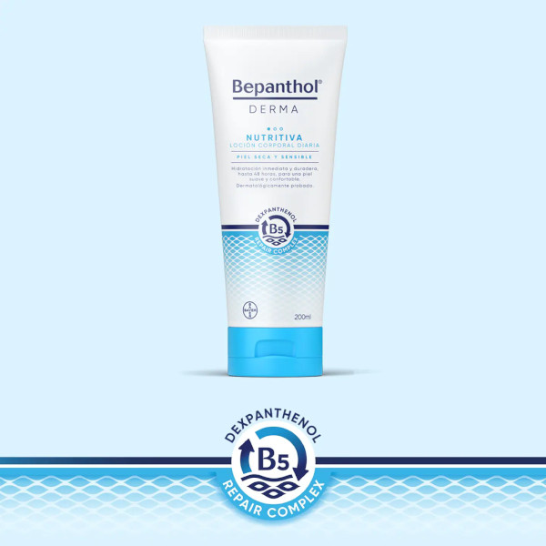 Bepanthol Derma Nutritiva calma la sensación de picor de la piel, suaviza y aporta un extra de hidratación a la piel seca. Su textura ligera, no es pegajosa y se absorbe rápidamente para aportar un alivio inmediato y eficaz a la piel.