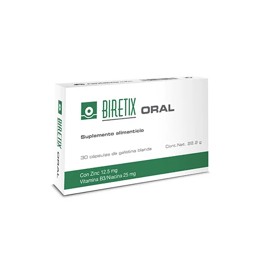 El Zinc presente en Biretix Oral en forma de sal de gluconato (mejor tolerado por el aparato digestivo que otras sales), es un elemento importante en el cuerpo humano ya que participa en diversos procesos metabólicos como el de los ácidos grasos, en el que contribuye a su metabolismo normal. Además, el Zinc favorece también el metabolismo normal de la Vitamina A, siendo ambos nutrientes que intervienen en procesos de diferenciación celular y que ayudan a mantener la piel en condiciones normales. El Zinc también juega un papel en la protección de las celúlas frente al daño oxidativo.