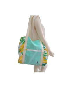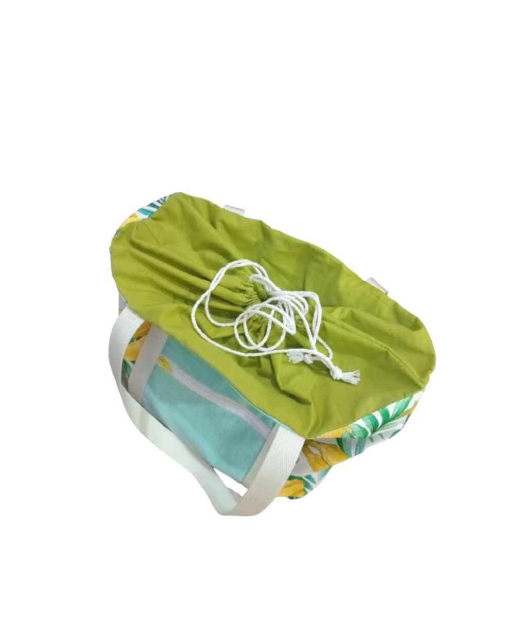 Confeccionado artesanalmente con loneta con motivos tropicales, con forro de algodón y con telas que proceden de otros proyectos, a las cuales se le está dando una segunda vida.