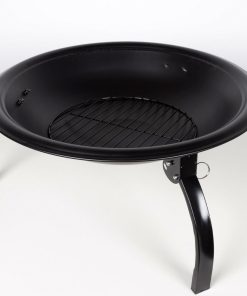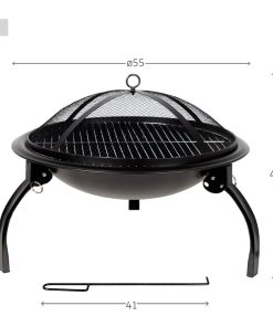 - Brasero exterior portátil Aktive Barbecue 2 en 1. Mide Ø55×42 cm, es color negro, tiene forma circular y se sostiene del suelo por tres patas plegables