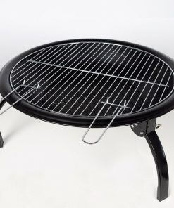 Brasero de exterior portátil Aktive Barbecue. Es color negro y está fabricado de acero. Se compone de un brasero circular sostenido por tres patas plegables (para plegarlas se debe tirar de la anilla). Incluye dos parrillas de acero cromado (una para colocar sobre ella los alimentos y otra para colocar el carbón o la leña), dos mangos extraíbles, un atizador para avivar el fuego y una rejilla antichispas. Perfecto para aprovechar al máximo las zonas exteriores, tanto como elemento decorativo como barbacoa. Se debe instalar sobre una superficie nivelada y estable.