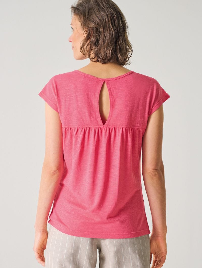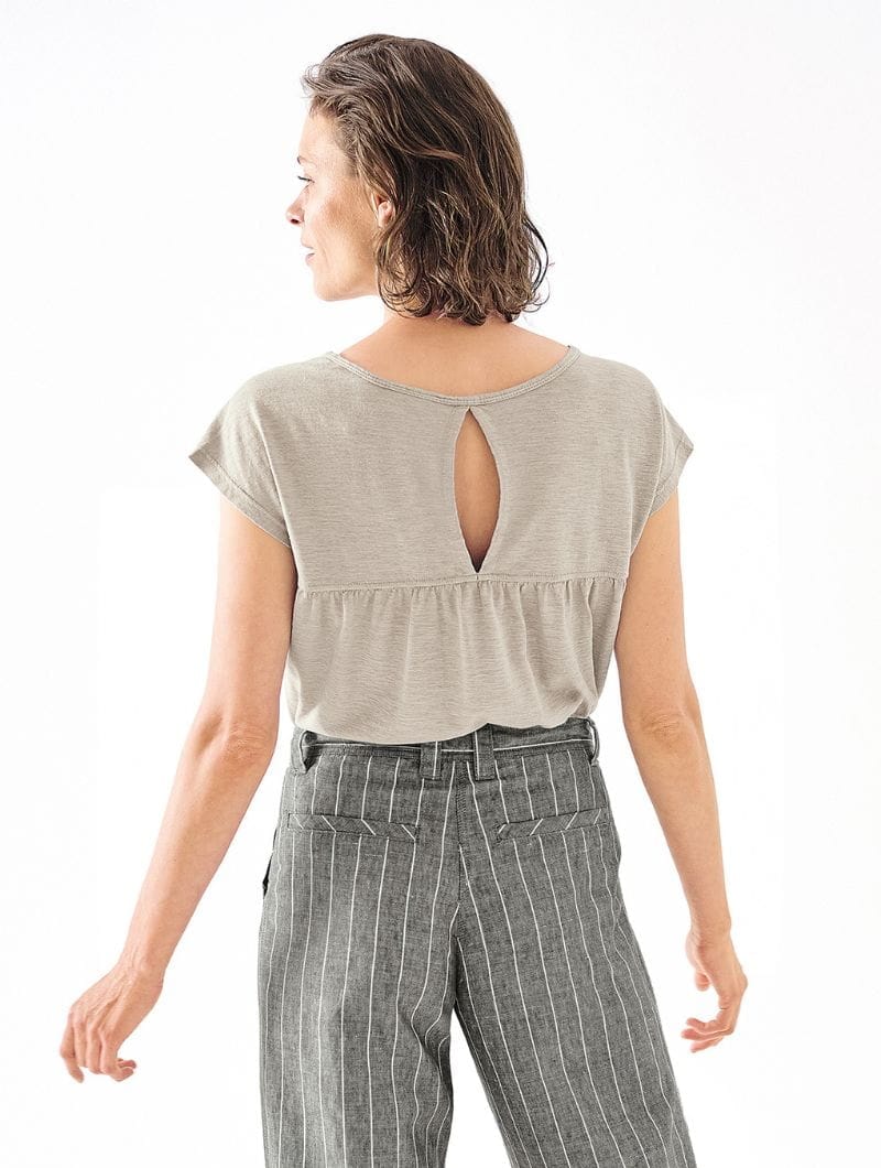 Camiseta sin mangas con fruncido en hombros y escote lágrima en la espalda.