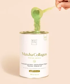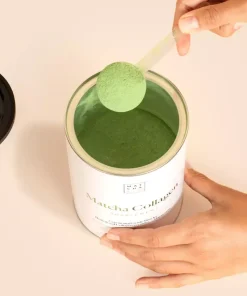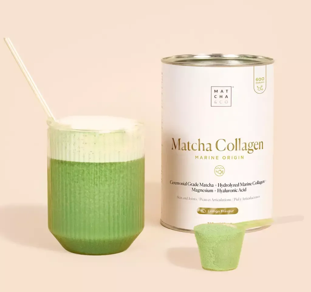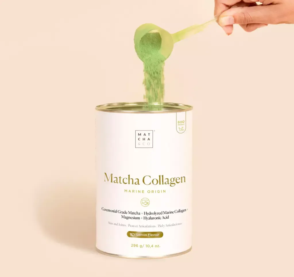 suplemento dietético de alta calidad que combina cuatro ingredientes esenciales para mejorar la salud de la piel, los huesos y los tendones: péptidos de colágeno, magnesio, ácido hialurónico y té matcha.