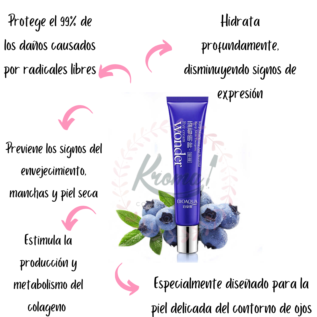 Esta crema otorga un potente efecto de hidratación al contorno de los ojos, protegiendo de los diferentes agentes contaminantes que provocan el envejecimiento prematuro, elimina las manchas negras y moradas producidas por el cansancio, rellenando las arrugas y lineas de expresión, aportando juventud.