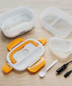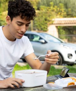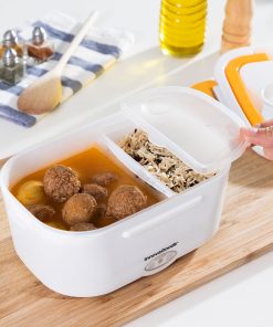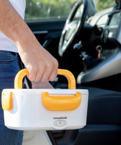 Una fiambrera eléctrica para coche muy práctica para calentar la comida o mantenerla caliente sin necesidad de microondas. Ideal para llevar la comida al trabajo o de viaje y calentarla fácilmente en el coche. Su funcionamiento es muy sencillo, sólo hay que conectar la fiambrera a la toma del encendedor del coche mediante el cable adaptador extraíble incluido, esperar unos minutos y disfrutar de comida casera caliente. Su capacidad es de 1,05 L y puede alcanzar una temperatura máxima de hasta 70 ºC. En su interior, dispone de una bandeja extraíble con 2 compartimentos independientes y de un recipiente con tapa más pequeño y también extraíble, por lo que ambos que se pueden limpiar con facilidad en el lavavajillas. El recipiente con tapa es muy útil para ensaladas o postres y el otro para los alimentos que vayan a calentarse. La tapa de la fiambrera cuenta con una válvula de expulsión de vapor y un compartimento para cubiertos donde se incluye una cuchara. Además, tiene 4 pestañas de cierre de seguridad y asa de transporte plegable para llevar a cualquier parte con mayor comodidad. Puede utilizarse también como fiambrera convencional para alimentos fríos o frescos.