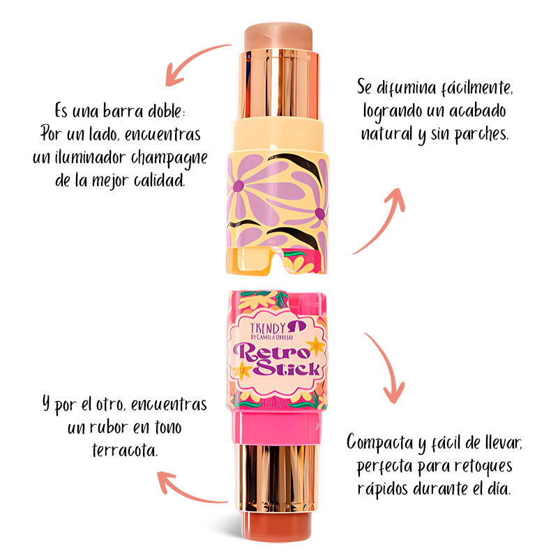 El Iluminador y rubor en barra Retro Stick Trendy combina dos funciones en un práctico formato. Su textura cremosa permite una aplicación fácil y un difuminado perfecto, añadiendo luminosidad y color natural a tu rostro. Ideal para retoques rápidos, aporta un acabado radiante y fresco para todo tipo de piel.