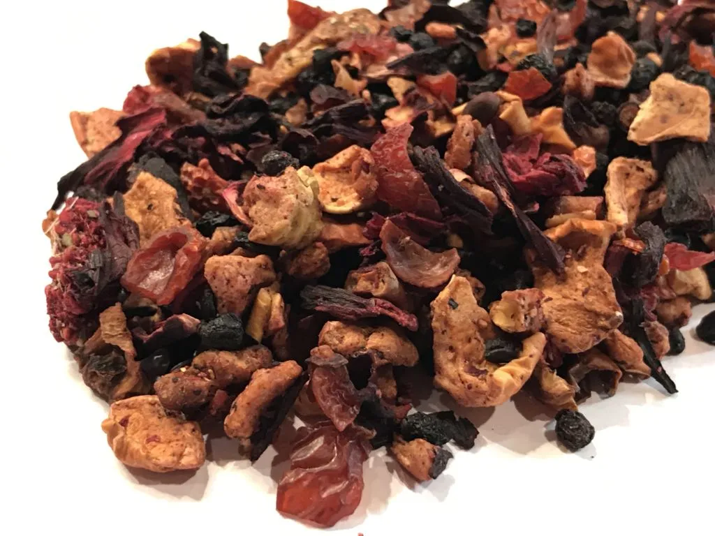 INGREDIENTES: Hibisco, grosellas negras, bayas de saúco, pétalos de rosa, fresas y moras.