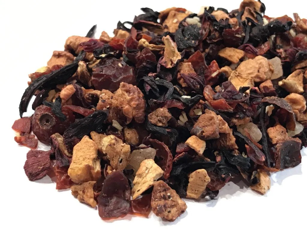 INGREDIENTES: Manzana, flor de hibisco, cáscara de escaramujo, cubitos de piña y ralladura de coco.