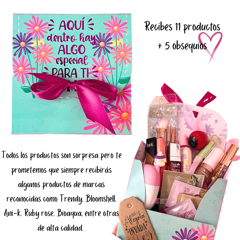 - Reúne 11 productos de excelente calidad que se seleccionan al azar , siempre recibirás productos de marcas reconocidas (Trendy o bloosmhell o Ani-k o Rubyrose, entre muchas otras de excelente calidad, recuerda que la armamos al AZAR, pero te prometemos que serás MUY MUY feliz.