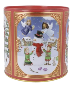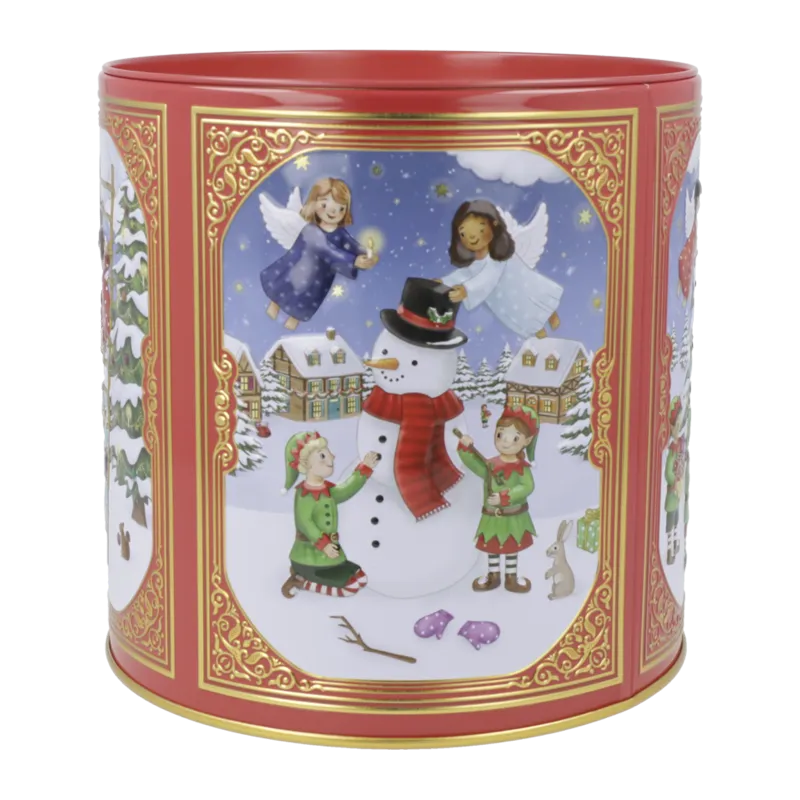 Lata metálica cilíndrica con forma de tambor e ilustraciones navideñas, de 150g.