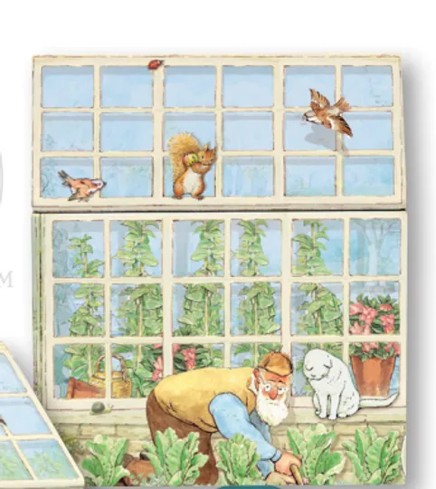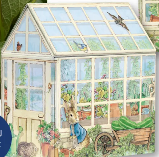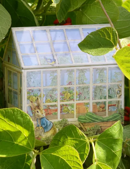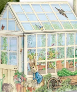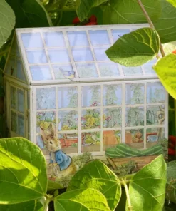 Lata metálica con forma de casita. Modelo Peter Rabbit de la diseñadora inglesa Beatrix Potter.