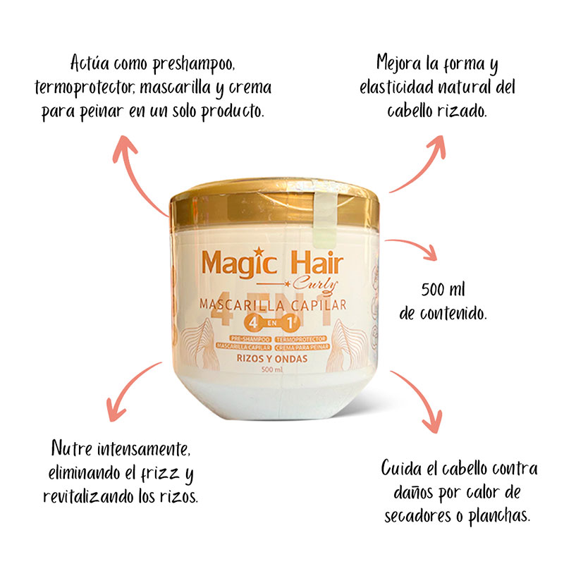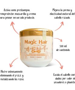 La Mascarilla Capilar Rizos 4 en 1 Magic Hair está formulada especialmente para cuidar y definir los rizos. Su fórmula multifuncional nutre, hidrata, suaviza y controla el frizz en una sola aplicación. Ideal para todo tipo de cabello rizado, proporcionará rizos más definidos, suaves y saludables con cada uso.