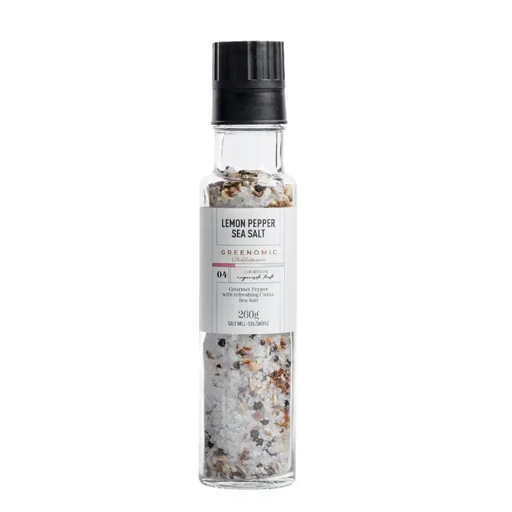 La sal marina se complementa perfectamente con el sabor refrescante del limón y el picante de la pimienta, ideal para pescado, aves o simplemente para sazonar.