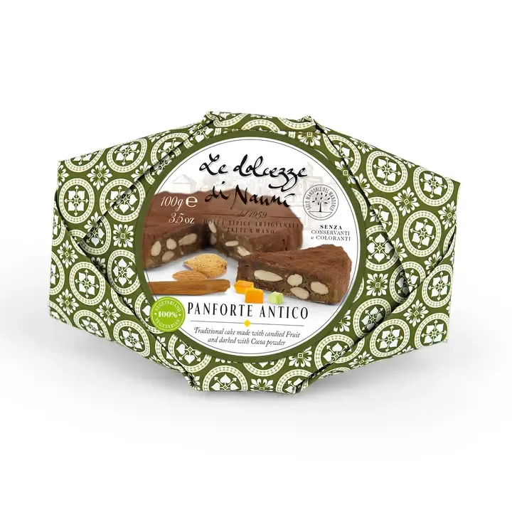 El Panforte di Nanni es conocido en todo el mundo por el sabor genuino creado con ingredientes de la más alta calidad exclusivamente naturales y sin conservantes. El Panforte se cocina en una olla de cobre y luego se trabaja a mano para mantener su aroma, sabor, aromas y todas las cualidades que hacen que este postre antiguo sea irresistible.En esta versión «antigua» es particularmente picante, con vainilla y canela, en polvo con cacao y frutas confitadas y almendras. Excelente como postre o merienda para disfrutar acompañado de un buen Vin Santo o Moscatello. Emprendedor, como aperitivo o plato para servir a amigos y familiares acompañado de quesos semicurados. Ideal como aperitivo energético por excelencia con ingredientes 100% naturales, adecuado antes o después de un entrenamiento deportivo o fatiga física.