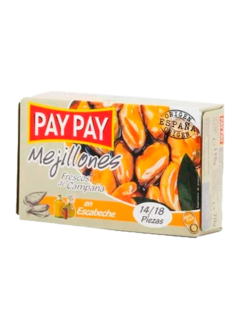 Pay Pay Mejillón en Escabeche Lata 14/18 es un producto de alta calidad originario de las costas de Galicia, España. Los mejillones, seleccionados por su tamaño y frescura, se conservan en una marinada a base de vinagre, aceite y especias, que les otorga un sabor agridulce y ligeramente picante. Son ideales como aperitivo, en ensaladas o como complemento en tapas. Su presentación en lata asegura frescura y conveniencia.