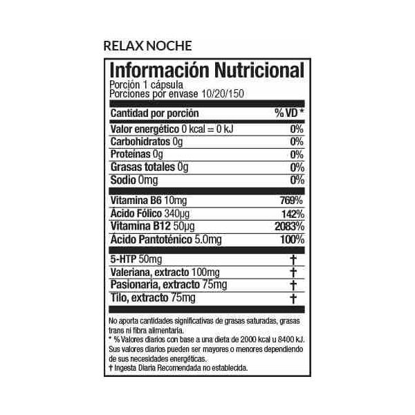 INGREDIENTES PRINCIPALES POR CÁPSULA: 5-HTP 50 mg, valeriana 100 mg, pasionaria 75 mg, tilo 75 mg, vitamina B6 10 mg, ácido fólico 340 µg, vitamina B12 50 µg, ácido pantoténico 5 mg.