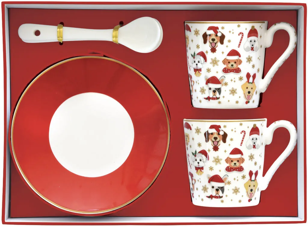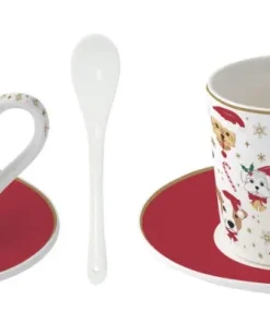 Set de 2 tazas con plato y cucharillas para espresso con 100 ml. de capacidad. Nuestros amigos los perros lucen festivos con sus gorros de Navidad.