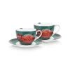 Un conjunto de 2 tazas y platillos de espresso azul oscuro decorados con una variedad de bayas, bellotas y flores de temporada. Cada taza está decorada con elementos lujosos, como el acabado dorado en el mango.