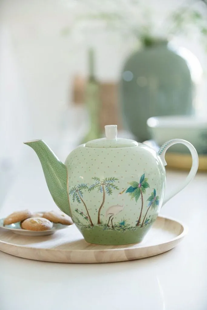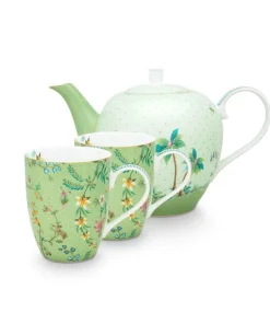 ¿Disfrutando de un desayuno temprano por la mañana? Con este gran juego de té alegrarás tu vajilla de inmediato. Este conjunto contiene dos tazas, que tienen un fondo verde y están decoradas con múltiples flores de colores. Además encontrará una tetera con un diseño tropical y un pico verde.