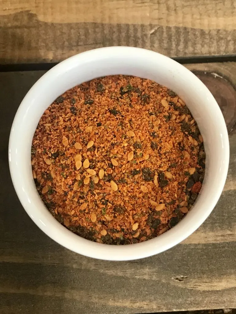 INGREDIENTES: Chile o guindillas en polvo, piel de mandarina tostada, semillas de sésamo amarillo y negro, semillas de amapola, pimienta de Sichuan, jengibre y alga nori.