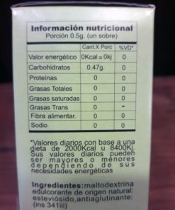 - Calorías: No tiene. El esteviósido, principio activo, no tiene calorías ya que no es metabolizado por el organismo.