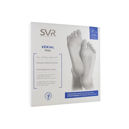 1 par para renovación de la piel de los pies. Xérial Peel de SVR es una mascarilla exfoliante para un nuevo efecto de piel. Altamente concentrado en ingredientes activos queratolíticos y emolientes, se dirige solo a las áreas rugosas y engrosadas del pie para preservar las áreas sensibles: