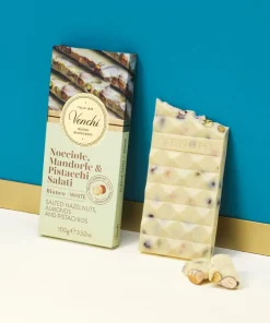 Tableta de chocolate blanco con avellanas del Piamonte y al menos un 25% de almendras y pistachos ligeramente salados. La combinación perfecta de dulce y salado, cremoso y crujiente. Ideal para disfrutar como aperitivo, combinado con un vino frío o una copa de Prosecco. La tableta de 100 g se presenta en un envoltorio especial que conserva la frescura, a su vez dentro de una elegante caja. La tableta forma parte de la gama de avellanas y chocolate blanco con frutos secos salados, disponible en una amplia selección de tabletas y barritas de aperitivo. Naturalmente sin gluten.