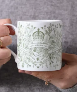 La taza de la coronación del rey Carlos III lleva las flores nacionales del Reino Unido junto con el roble, un símbolo de fuerza y estabilidad, y la hiedra, el símbolo del compromiso, que se arrastra a lo largo de este intrincado diseño dibujado a mano.