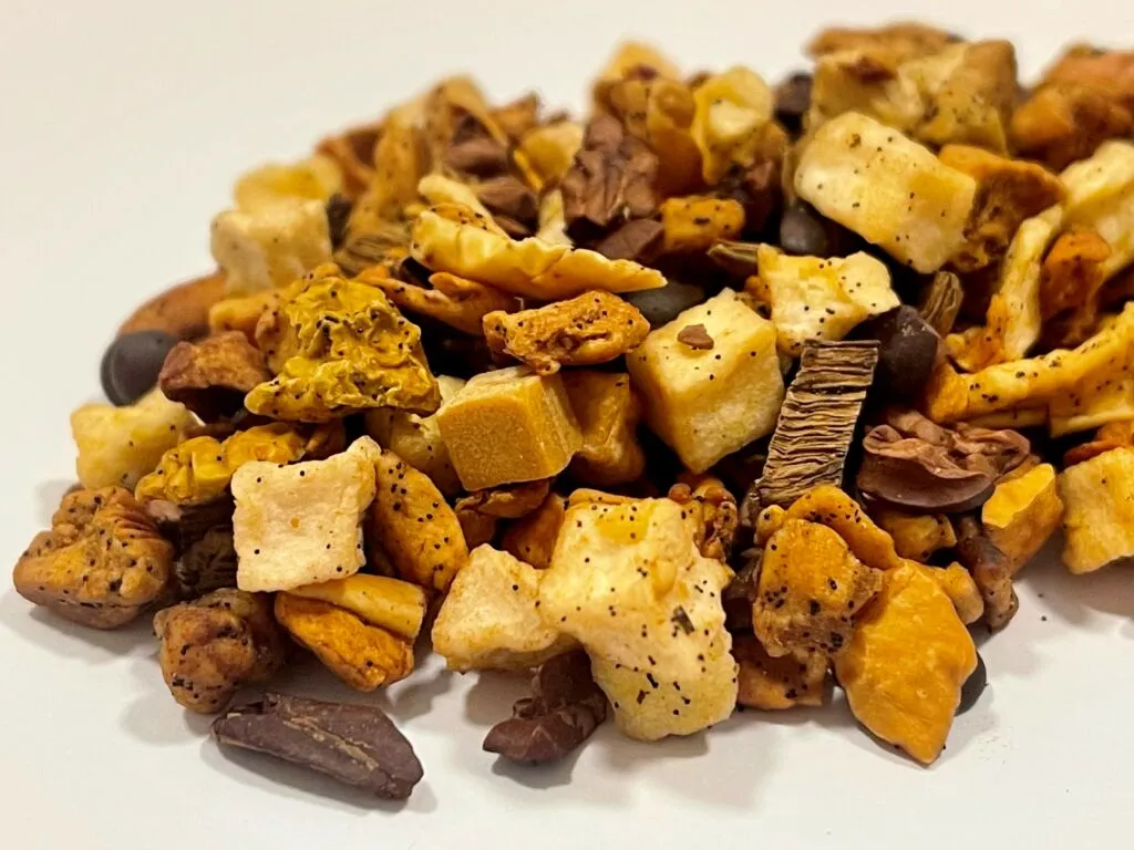 ngredientes : pepitas de cacao (40%), trozos de manzana (tostada), gotas de chocolate (azúcar, manteca de cacao, mantequilla concentrada (leche) , cacao en polvo bajo en grasa, emulgente ( soja )) (10%), trozos de manzana blanca. , trozos de caramelo ( leche desnatada azucarada condensada , azúcar, jarabe de glucosa, mantequilla concentrada (leche) ,aroma natural, trozos de canela, trozos de vainilla