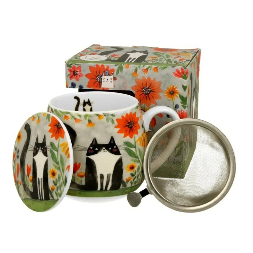 Set para hacer infusiones compuesta por una taza de porcelana de 430 ml. de capacidad con filtro de acero inoxidable y tapa a juego. El conjunto viene en una bonita caja de regalo todo ello decorado de tal manera que hará las delicias de los amantes de los gatos