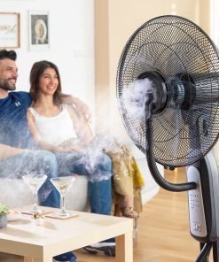 - Nebulizador: La función de humidificación produce un pulverizado suave y agradable. El uso combinado de ventilador y humidificador es ideal en climas secos, ya que la humedad impregna el aire combatiendo las altas temperaturas. Dispone de un indicador LED que se iluminará en rojo cuando ya no quede agua en el depósito.