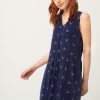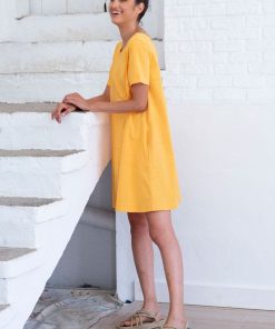 Este vestido de manga corta para mujer presenta patrón en forma de «A» y bolsillos laterales. Cuenta con bonito escote redondo en la espalda y una costura central.